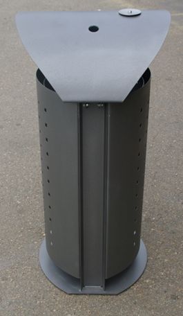 Atkritumu urna no melnā metāla ar dekoratīvu perforāciju. Paceļams urnas vāks, aizslēdzama ar atslēgu; NT pelnutrauks atkritumu urnas vāka virspusē; 2 atveres izsmēķu iemešanai no augšas; stīpa maisa nostiprināšanai.