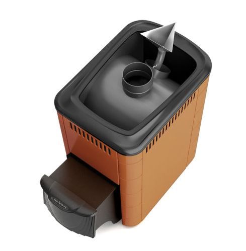 В закрытой каменке, прогреваемой круговым потоком пламени, камни прогреваются до температуры 600°С.