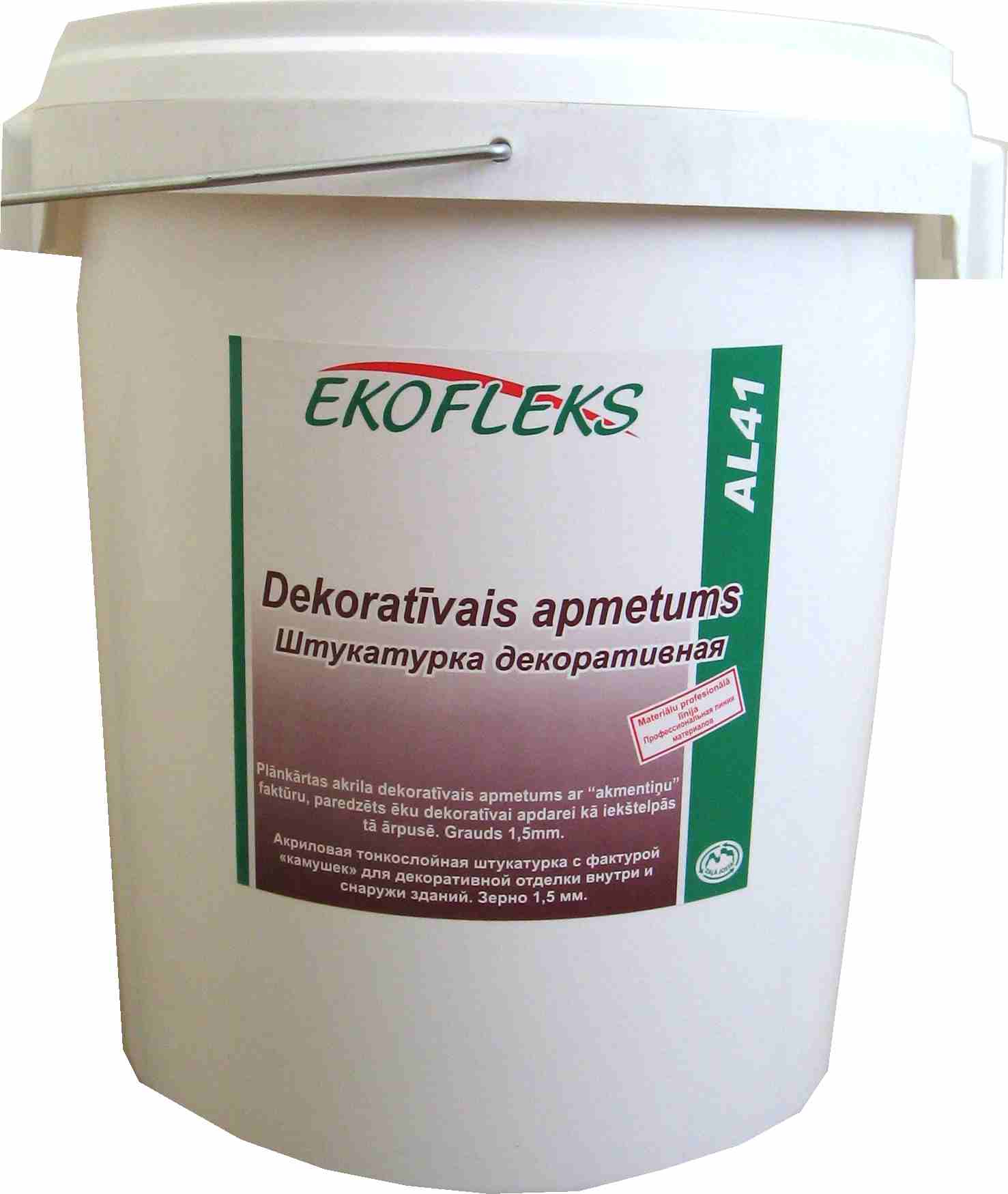 Plānkārtas akrila dekoratīvais apmetums ar “akmentiņu” faktūru, paredzēts ēku dekoratīvai apdarei kā iekštelpās tā ārpusē. Grauds 1,5mm.