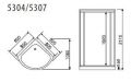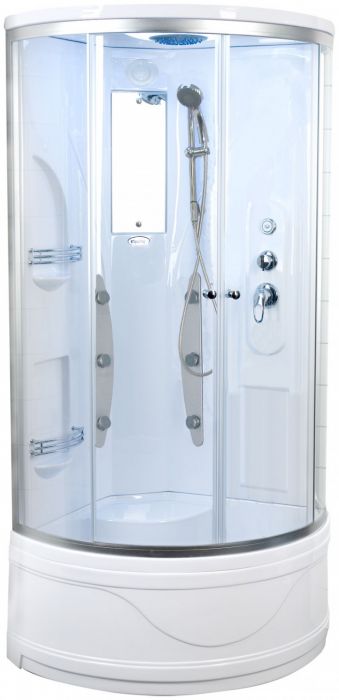Noapaļotas formas dušas kabīne 92x92x217 cm ar dziļo paliktni, domāta uzstādīšanai telpas stūrī. Profils izgatavots no aluminija un nokrāsots sudraba krāsā. Sienas izgatavotas no caurspīdīga rūdītā stikla, durvis atbīdamas uz abām pusēm. Paliktnis ar regulējamām kājām nostiprināts ar nerūsējošu karkasu, jumtiņš un aizmugures siena izveidoti no baltas krāsas akrila.