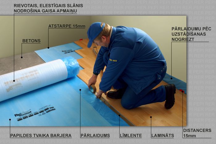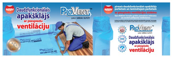'PROVENT'' - lamināta un parketa grīdu ieklāšanai uz betona pamata - ar papildus tvaika izolāciju un MICROPUMPING ūdens tvaika izvadīšanas sistēmu un paaugstinātu triecientrokšņu izolāciju. Jaunā izolācijas materiāla gofrētā apakšējā virsma veido kanālu sistēmu , kas, staigājot pa parketu, nodrošina gaisa un ūdens tvaiku apmaiņu. Gaisa apmaiņai nepieciešams atstāt nelielas spraugas starp parketa virsmu un grīdas līsti. Pielaminētā papildus tvaika barjera aizsargā parketu no ūdens tvaiku iedarbības , tadejādi aizsargājot to no uzbriešanas ļīdz ar to nav nepieciešams vēl kādas papildus plēves. Labāks soļu trokšņu samazinājuma rādītājs salīdzinot ar parasto izolāciju 20DB PROVENT izolācija būtiski kāpina būvniecības tempus , jo pieļauj augstāku betona mitruma koeficientu pie ieklāšanas, līdz ar to nav nepieciešams gaidīt pilnīgu betona pamatnes izzūšanu . PROVENT arī novērš pelējuma veidošanos . Tas ne tikai pasargā konstrukciju , bet arī cilvēku veselību, novēršot dažādu slimību veidošanos, kuras izraisa tieši pelējums. |  ( + ) palielināt
