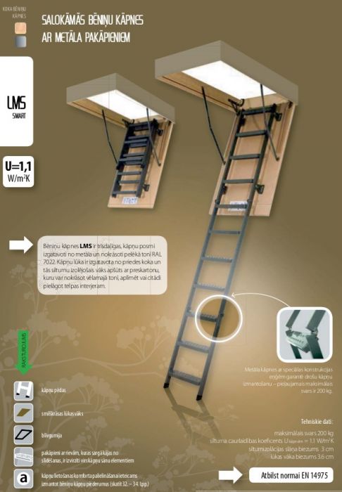 Bēniņu kāpnes LMS ir trīsdaļīgas, kāpņu posmi izgatavoti no metāla un nokrāsoti pelēkā tonī RAL 7022. Kāpņu lūka ir izgatavota no priedes koka un tās siltumu izolējošais vāks apšūts ar preskartonu, kuru var nokrāsot vēlamajā tonī, aplīmēt vai citādi pielāgot telpas interjeram.