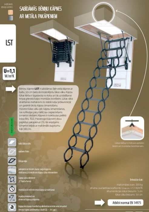 Bēniņu kāpnes LST ir sabīdāmas šķērveida kāpnes ar baltu, 3.6 cm biezu termoizolējošu lūkas vāku. Kāpņu