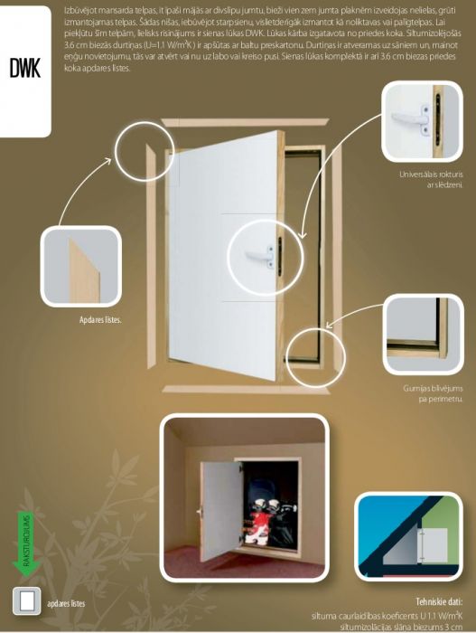 Izbūvējot mansarda telpas, it īpaši mājās ar divslīpu jumtu, bieži vien zem jumta plaknēm izveidojas nelielas, grūti izmantojamas telpas. Šādas nišas, iebūvējot starpsienu, vislietderīgāk izmantot kā noliktavas vai palīgtelpas. Lai piekļūtu šīm telpām, lielisks risinājums ir sienas lūkas DWK. Lūkas kārba izgatavota no priedes koka. Siltumizolējošās 3.6 cm biezās durtiņas (U=1.1 W/m2K ) ir apšūtas ar baltu preskartonu. Durtiņas ir atveramas uz sāniem un, mainot eņģu novietojumu, tās var atvērt vai nu uz labo vai kreiso pusi. Sienas lūkas komplektā ir arī 3.6 cm biezas priedes koka apdares līstes.