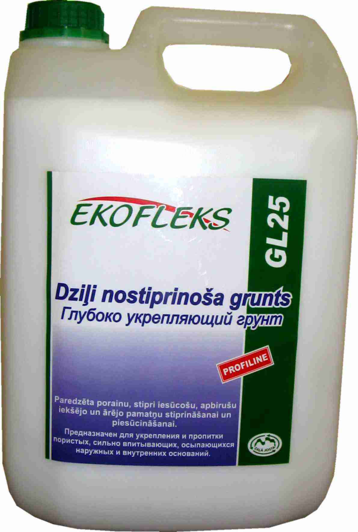 Dziļi nostiprinoša grunts Ekofleks GL25 ir paredzēta grīdu, sienu un griestu virsmu gruntēšanai telpās un ārpus tām. Tai piemīt augstas salīmēšanas un iesūkšanās spējas, kā arī tā nostiprina irdenas un drūpošas virsmas. Tiek lietota pirms cementa un betona grīdu pamatņu remonta, grīdu apdares materiālu uzklāšanas, sienu špaktelēšanas un apmetuma uzklāšanas, akmens vates un putupolisterola pielīmēšanas, krāsošanas un dažādu veidu tapešu pielīmēšanas, kā arī galdniecības, kokapstrādes materiālu, ģipša un ģipšplākšņu nogruntēšanai.