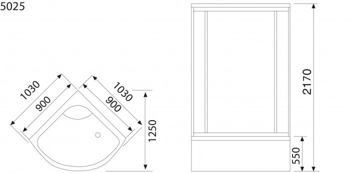 Noapaļotas formas dušas kabīne 103x103x217 cm ar dziļo paliktni, domāta uzstādīšanai telpas stūrī. Profils izgatavots no aluminija un nokrāsots sudraba krāsā. Sienas izgatavotas no caurspīdīga rūdītā stikla, durvis atbīdamas uz abām pusēm. Paliktnis ar regulējamām kājām nostiprināts ar nerūsējošu karkasu, jumtiņš un aizmugures siena izveidoti no baltas krāsas akrila.