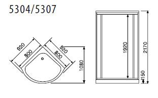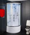Noapaļotas formas dušas kabīne 92x92x217 cm ar dziļo paliktni, domāta uzstādīšanai telpas stūrī. Profils izgatavots no aluminija un nokrāsots sudraba krāsā. Sienas izgatavotas no caurspīdīga rūdītā stikla, durvis atbīdamas uz abām pusēm. Paliktnis ar regulējamām kājām nostiprināts ar nerūsējošu karkasu, jumtiņš un aizmugures siena izveidoti no baltas krāsas akrila.