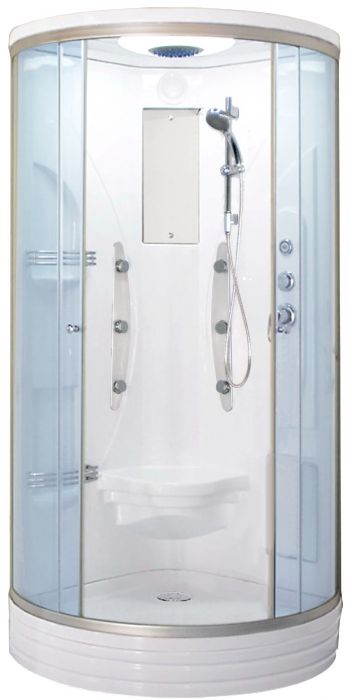 Noapaļotas formas dušas kabīne 92x92x217 cm domāta uzstādīšanai telpas stūrī. Profils izgatavots no aluminija un nokrāsots sudraba krāsā. Stikla sienas izgatavotas no caurspīdīga rūdītā stikla, durvis atbīdamas uz abām pusēm. Paliktnis ar regulējamām kājām nostiprināts ar nerūsējošu karkasu, jumtiņš un aizmugures siena izveidoti no baltas krāsas akrila.