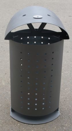Atkritumu urna no melnā metāla ar dekoratīvu perforāciju. Paceļams urnas vāks, aizslēdzama ar atslēgu; NT pelnutrauks atkritumu urnas vāka virspusē; 2 atveres izsmēķu iemešanai no augšas; stīpa maisa nostiprināšanai.