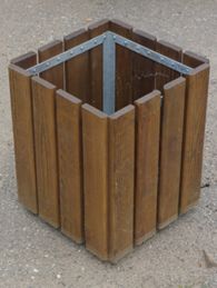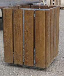 Atkritumu urna ar koka dēlīšiem, metāla karkass un pamatne. Ar vai bez izņemamu cinkotu spaini.
