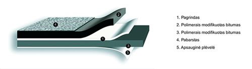Polimēr-bitumena ruļļveida jumta segums.