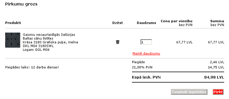 Kad esat atraduduši vēlamo un veikals ir izskaitļojis pirkuma summu, atsūtiet mums uz e-pastu saglabāto Pirkuma Groza ekrānšāviņu: